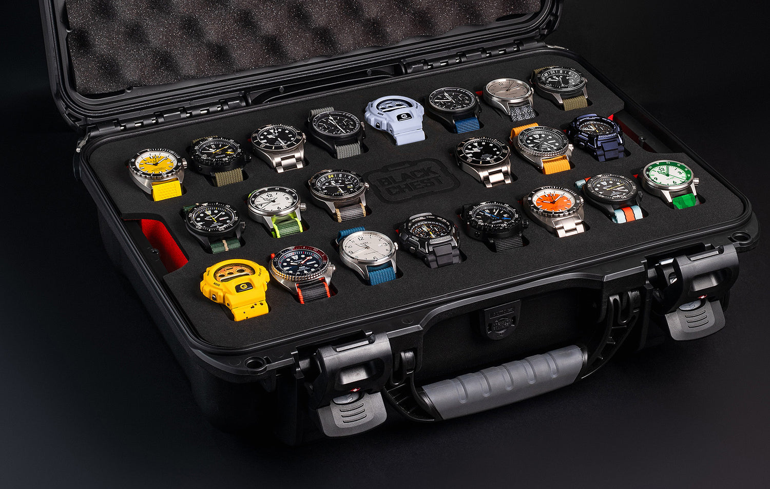 Black Chest cases are made to protect your watches and gear to the extreme! This is the case you get when you want to travel with your watches and not worry about anything. Rock solid on the outside, soft and shockproof on the inside, waterproof, pressure equalised, the list of features goes on and on, the point is... your next trip... don't leave your watches at home!