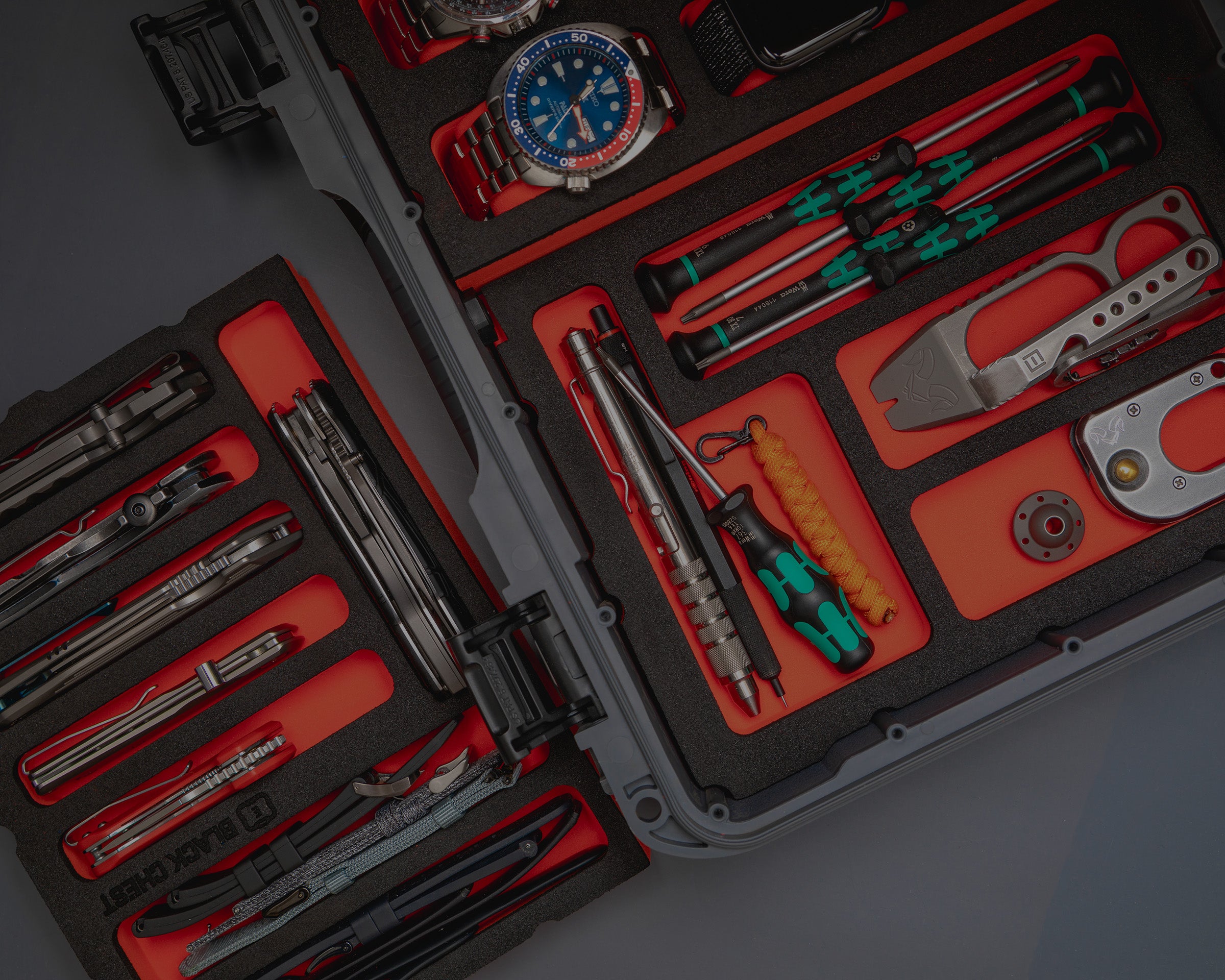 The 6W2EDC is our most versatile case. It's been designed in a 3 section setup to include space for 6 watches on the left side, and a dual tier on the right side to allow for straps, accessories, knives, tools and other items. It's the ideal case for the gear head and it serves as safe transport for all your kit and a kick-ass display too!
